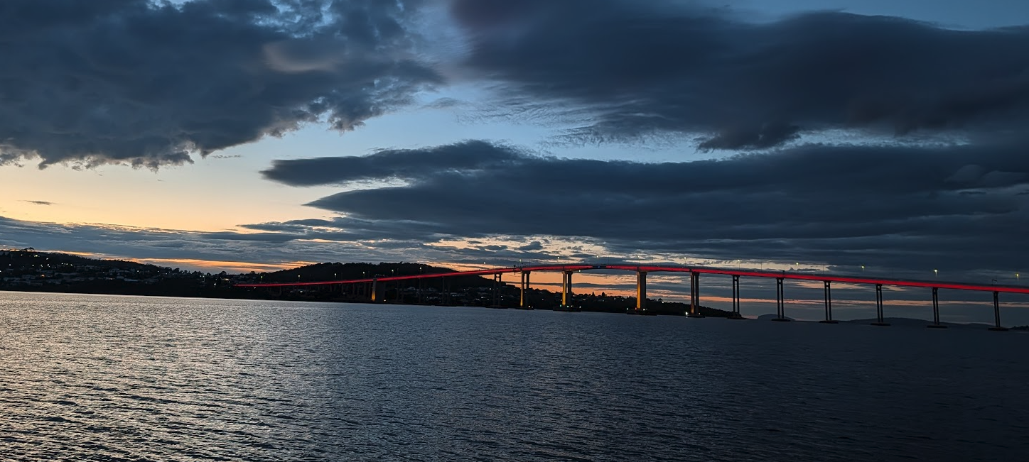 At around seven hours, after another feed, Val told me it was about forty minutes to the finish. I almost didn’t believe him — until I looked ahead and saw it: the Tasman Bridge, fully lit, unmistakable.
